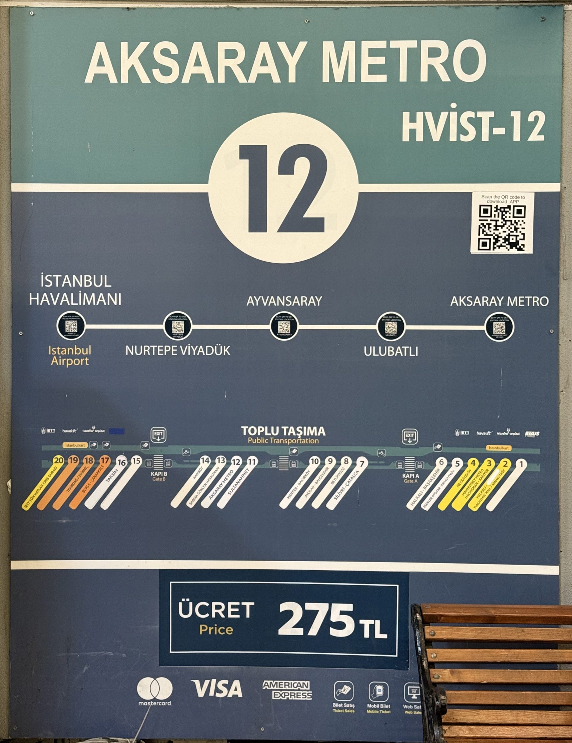 Từ sân bay về trung tâm Istanbul có khoảng 20 trạm dừng. Giá vé chỉ 275 TL/chuyến, có khoang để hành lý rất tiện. Vé có thể mua trực tiếp, thanh toán bằng Visa/Master card hoặc thẻ Istanbulkart đều được!